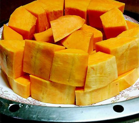 3. 南瓜处理:将南瓜去皮去籽,切成小块,放入蒸锅中蒸熟。